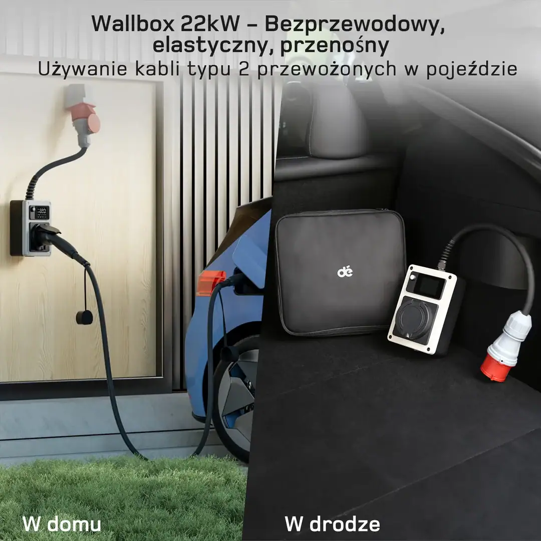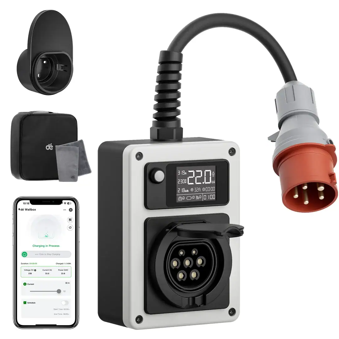 Mobilny wallbox dé z gniazdem Typ 2 22kW dla aut EV to nowoczesna przenośna ładowarka dla samochodów elektrycznych. Łączy ona wygodę, bezpieczeństwo i wysoką moc ładowania. W rezultacie to idealne rozwiązanie dla kierowców aut elektrycznych, którzy chcą ładować swój pojazd w dowolnym miejscu — w domu, garażu, w pracy lub w podróży.