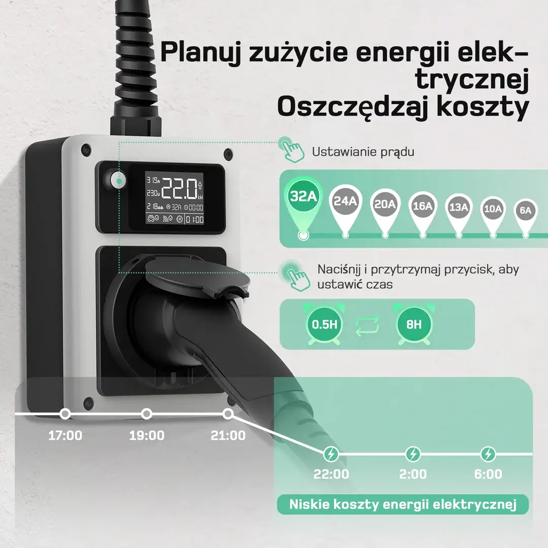 - Regulacja prądu: 6A / 10A / 13A / 16A / 20A / 24A / 32A – dopasowanie do instalacji.