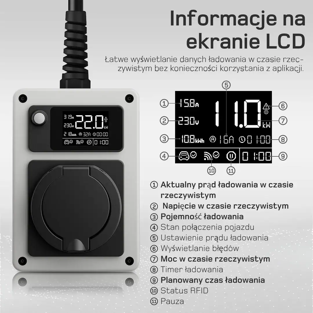 Wbudowany ekran LCD pokazuje wszystkie kluczowe parametry – czas, napięcie, moc i temperaturę ładowania. Wysokiej klasy zabezpieczenia chronią przed przeciążeniem, przepięciem, przegrzaniem, zwarciem i błędnym uziemieniem. Co więcej, wewnętrzny wyłącznik różnicowoprądowy typu B (30 mA AC + 6 mA DC) gwarantuje bezpieczeństwo zgodne z normami dla ładowania pojazdów EV.